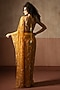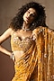 Featuring a mustard yellow pre-stitched saree in net and satin base. It is paired with a hand embroidered blouse. Accentuate it with emerald jewellery and heels for festive occasions or haldi ceremonies.