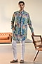 Featuring a blue bundi jacket in russian silk base with floral digital print. It is paired with a matching kurta. This contains only two piece.