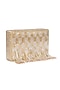 Featuring a gold and silver clutch in raw silk base with tassels and cutdana embellishments, including a detachable strap.