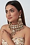 Featuring a gold finish necklace studded with kundan polki, maroon stone ghera and green bead hanging, set in mixed metal. It is paired with a matching pair of earrings.