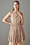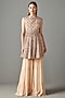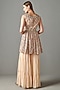 Featuring a beige peplum in georgette base with carpet print. It is paired with matching gharara pants.