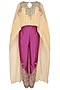 This set features a golden cape top in georgette base appliqued gold foil jewel yoke. It has small key hole at the front. It comes along with a wine silk trouser pants with gold floral embroidery.