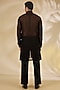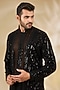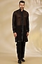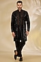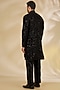 Featuring a black indowestern jacket in net base with cutwork. It is paired with a sheer shirt having thread and sequins work, including crepe pants. Style it with mojaris for a festive occasion, wedding or sangeet ceremony.