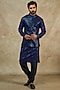 Featuring a blue bundi jacket in georgette base with sequins and jaal embroidery. Perfect wear for a festive occasion or pooja ceremony.