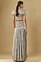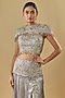 Featuring a grey shoulder cape in shimmer georgette base with 3D floral cutwork, sequins and beads embroidery. It is paired with a net blouse and a skirt. Accentuate it with statement earrings and strappy heels, perfect for receptions, cocktail nights and festive celebrations.