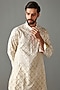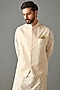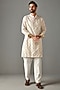 Featuring an ivory bundi jacket in foil georgette base. It is paired with a matching chanderi kurta and cotton silk pants.