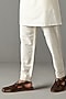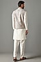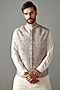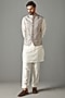 Featuring a grey bundi jacket in raw silk base. It is paired with a contrasting ivory cotton silk kurta and pants.