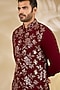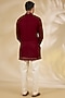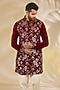 Featuring a maroon kurta in georgette base with print, loop buttons detail and sequins embroidery. It is paired with cotton silk pants. Style it with a pair of kolhapuri sandals for a festive occasion, wedding or engagement ceremony.