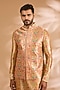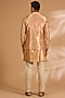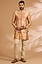 Featuring a multi-colored bundi jacket in banarasi silk base with zari and print detailing. It is paired with a kurta and cotton silk pants. Style it with kolhapuri sandals for a festive occasion, wedding or engagement ceremony, exuding charm and elegance.