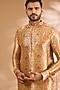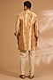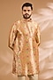 Featuring a multi-colored kurta in banarasi silk base with loop button, zari and and print detailing. It is paired with cotton silk pants. Style it with kolhapuri sandals for a festive occasion, wedding or engagement ceremony, exuding charm and elegance.