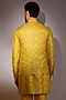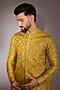 Featuring a mustard yellow bundi jacket in silk base with print and zari work. Perfect wear for a festive occasion, haldi or engagement ceremony.