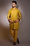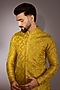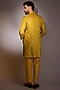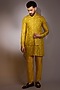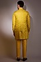 Featuring a mustard yellow bundi jacket in silk base with print and zari work. It is paired with a cotton silk kurta and pants. Perfect wear for a festive occasion, wedding or engagement ceremony.