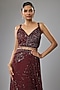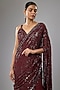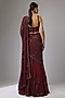 Featuring an ox blood red lehenga saree in net base with jaal, sequins and beads embroidery. It is paired with a blouse, a georgette drape and an underskirt. Accentuate it with statement earrings and heels, perfect for weddings, sangeet and festive celebrations.