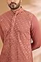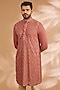 Featuring a rust orange kurta in georgette base with thread and sequins embroidery. It is paired with cotton silk pants. Style it with kolhapuri sandals for a festive occasion, wedding or engagement ceremony, exuding charm and elegance.