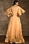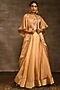 Featuring a champagne gold cape in silk chanderi and organza base with hand embroidery. It is paired with a matching skirt, a blouse, and a belt.