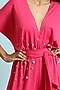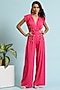Featuring a magenta jumpsuit in lycra and jersey base with hand embroidered pom-poms and a wrap-around tie.