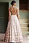 Featuring a pink lehenga in silk organza base with pansy paradise hand embroidery. It is paired with a contrasting nude viscose georgette blouse.