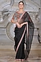 Featuring a black saree in organza and fendi silk base. It is paired with a blouse. Accentuate it with statement earrings, a clutch and block heels for weddings or sangeet ceremonies.