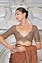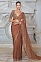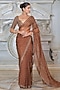 Featuring a brown saree in organza and fendi silk base. It is paired with a blouse. Accentuate it with statement earrings, a clutch and block heels for weddings or sangeet ceremonies.
