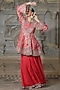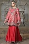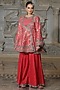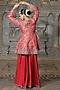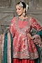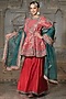 Featuring an orange pakistani kurta in organza and tissue base. It is paired with sharara pants and a green dupatta. Accentuate it with dangler earrings and heels for a festive occasion or wedding ceremony.
