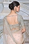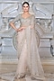 Featuring a peach saree in organza and fendi silk base. It is paired with a blouse. Accentuate it with statement earrings, a clutch and block heels for weddings or engagement ceremonies.