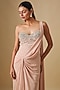 Featuring a beige gown saree in georgette, crepe and net base with hand embroidery. Accentuate it with dangler earrings and heels for a cocktail party or sangeet ceremony.