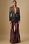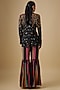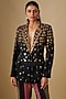 Featuring a black jacket in georgette and linen base with hand embroidery. It is paired with striped sharara pants. Accentuate it with dangler earrings and heels for a cocktail party or sangeet ceremony.