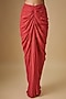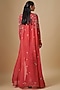 Featuring a coral jacket in crepe and georgette base with hand embroidery. It is paired with a waistcoat and a gathered skirt. Accentuate it with dangler earrings and heels for a festive occasion, wedding or sangeet ceremony.