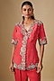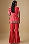 Featuring a coral jacket in crepe and georgette base with hand embroidery. It is paired with sharara pants. Accentuate it with dangler earrings and heels for a festive occasion, wedding or sangeet ceremony.