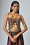 Featuring a multi-colored and black lehenga in crepe and georgette base with hand embroidery and stripe print. It is paired with an asymmetrical mesh top. Style it with statement earrings, a sleek bun and block heels, perfect for cocktail parties or a boho look.