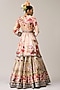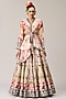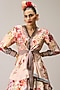 Rajdeep Ranawat presents a beige wrap tunic in poly satin and poly dupion base with printed cuffs, sleeves and belt detail. It is paired with a crystalised printed skirt having a can-can. Accentuate it with delicate stud earrings, and heels for a wedding, sangeet or an engagement look, that blends elegance with modern charm.