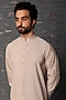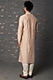 Featuring a biscuit pink pintuck kurta in katan base with floral block embroidery. It is paired with contrasting pataudi pants. Perfect wear for any festive occasion or pooja ceremony.