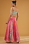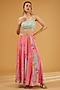 Featuring a hot pink jacket in organza base with hand embroidery. It is paired with crepe sharara pants and a powder blue bustier. Accentuate it with statement jewellery and heels for a wedding or festive occasion.