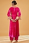 Featuring a hot pink kurta in silk velvet base with front puckering and hand embroidery. It is paired with velvet palazzo pants and an organza dupatta. Accentuate it with statement jewellery and heels for a festive gathering.