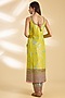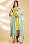 Featuring a lime yellow straight kurta in silk tissue and tissue organza base with hand embroidery. It is paired with silk tissue embroidered salwar and a scalloped dupatta. Style it with dangler earrings, cuff, and mojaris for a wedding or festive occasion.