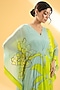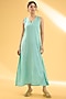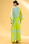 Featuring a powder blue and bright green kaftan dress in crepe base with floral motif hand embroidery. It is paired with a slip. Accentuate it with dangler earrings and heels for a festive look.