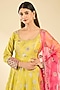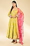 Featuring a yellow anarkali in silk tissue base with floral print, hand and machine embroidery. It is paired with a hot pink sheer organza embroidered dupatta. Accentuate it with statement jewellery and heels for a festive occasion, haldi or sangeet ceremony.