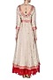 This set features a beige anarkali in georgette base with gota patti work all over paired with red net skirt. It comes along red net embroidered chiffon dupatta/