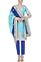 This set features a light blue boat neck straight kurta in raw silk base with gota hand embroidery on neckline and hem. It is paired with bright blue straight pants in raw silk and georgette blue ombre dyed dupatta with delicate gota work on border.