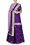 Featuring a purple kurta in pure silk and georgette with boat neckline defined with a fine silver golden gota patti embroidered handwork scattered. It is paired with matching lehenga skirt and dupatta.