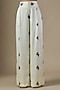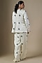 Featuring a white blazer in pure satin silk base with print and embroidery. It is paired with pants. Accentuate it with statement earrings and heels for an evening look.