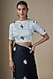 Featuring a black and white peplum blazer in suiting base with structured sleeves and abstract print. It is paired with a skirt having a slit. Accentuate it with pointed heels and minimal statement jewellery for a power-chic ensemble, ideal for work events, evening socials or stylish city outings.