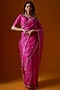 Featuring a bright pink saree in organza base with silver zari hand work. It is paired with a matching blouse.