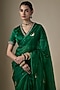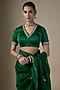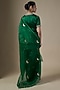 Featuring a green blazer in suiting base with tikki hand embroidery. It is paired with an ankle-length skirt and a blouse having a boat neckline and gold embroidery. Accentuate it with strappy heels and minimal statement jewellery for a chic ensemble, ideal for cocktail evenings or stylish night outings.