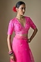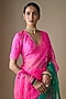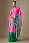 Featuring a pink and green saree in pure silk organza base with boota hand embroidery. It is paired with an unstitched blouse. Pair with statement gold jewelry and heels for weddings, festive events, evening parties, or receptions.