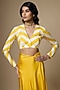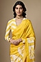 Featuring a yellow saree in pure habutai silk base with mughal inspired print. It is paired with an unstitched striped blouse piece. Accentuate it with sleek minimal jewellery and elegant heels for a refined ensemble, ideal for haldi ceremonies.