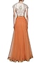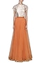 Featuring a cream and gold crop top in chevron chanderi silk base with hand embroidered mughal buta in tilla, zari, sequins and kundan at the back along with potli buttons on the front.