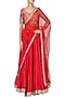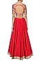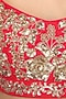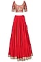 Featuring a crimson red blouse in chanderi silk base with floral motif hand embroidery on front and sleeves. It is paired with matching lehenga and embroidered dupatta.