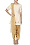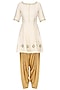 Featuring an ivory peplum kurta in blended silk base with contrast gold buttons on bodice. It is paired with gold satin crepe dhoti salwar and matching net embroidered dupatta.