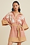 Featuring a red kimono dress in viscose linen base with print and 3D floral embroidery. It is paired with a contrasting yellow belt.